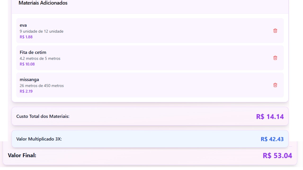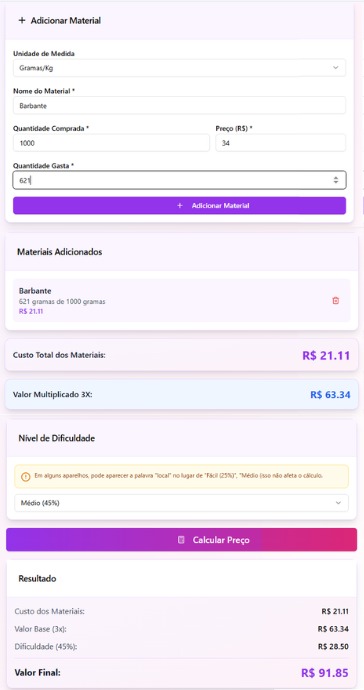 Você cadastra seus materiais, informa o que usou na peça e o nível de dificuldade — e a calculadora faz toda a conta pra você, entregando um preço justo e com lucro de verdade.